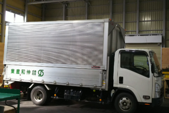 専用工場の中で荷下ろしをします。 帰社時間が遅い場合、運搬車両は施錠状態で、警備をかけ工場内で保管、翌日裁断します。 |